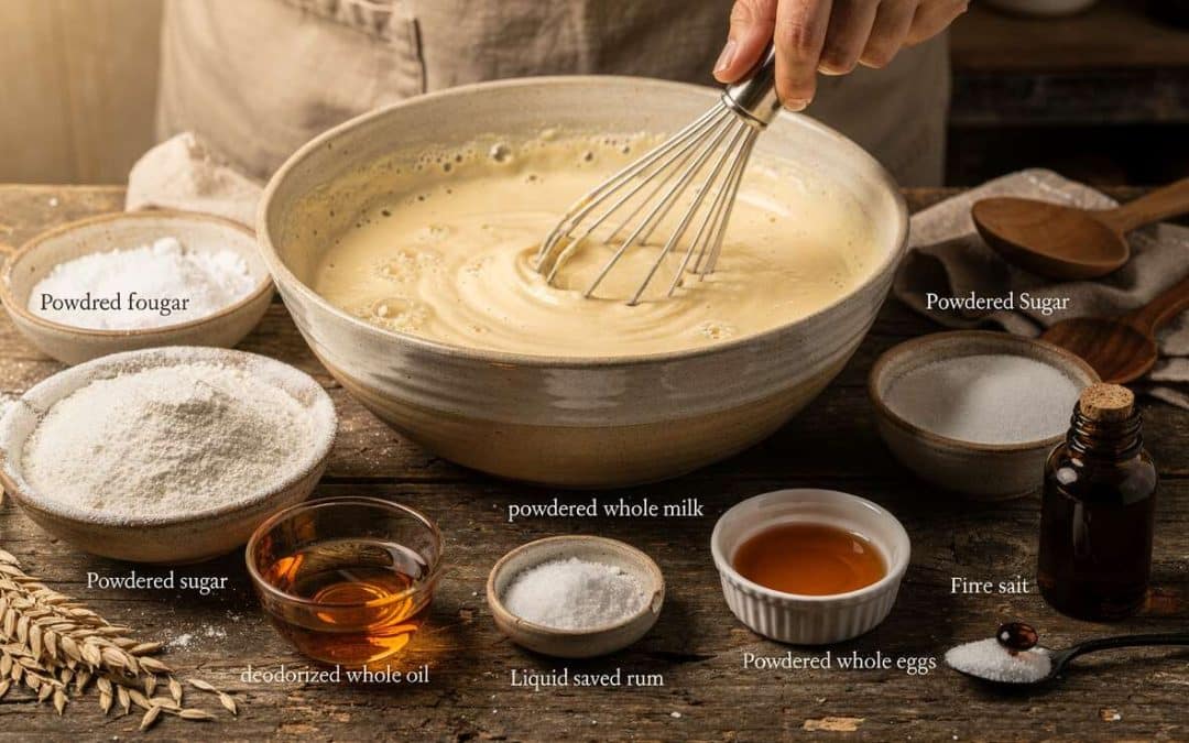 Dans un grand saladier, commencez par mélanger toutes les poudres : la farine, le sucre, le lait en poudre, la poudre d’œufs et la pincée de sel. L’idéal est de tamiser la farine, c’est-à-dire la passer à travers un tamis ou une passoire fine pour l’aérer et éviter les grumeaux. Dans un autre récipient, mesurez 500 ml d’eau tiède. L’eau tiède aidera à mieux dissoudre les poudres.